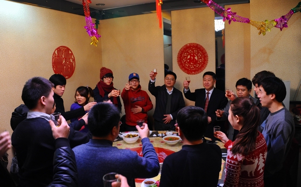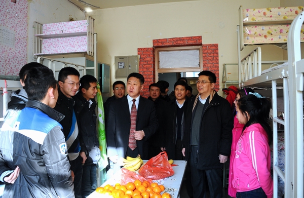 我校今年有部分学生或因为家庭较远、或复习考研、或留在学校附近打工等原因没有回家过年,为了方便同学们的生活和学习,他们集中在16号学生公寓和德润大厦住宿。我校每年都对留校同学尤其是留校的家庭经济困难学生十分关心,学生处领导给留校学生送去水果、瓜子、糖果等食品。此次校领导专程到学生公寓看望学生,并与他们一起吃团圆饭再一次体现了学校对学生的关心和爱护。