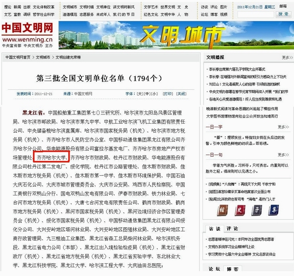 文明花开,再传捷报。全国精神文明建设工作表彰大会于2011年12月20日上午在北京隆重举行。中共中央政治局常委、中央文明委主任李长春出席并讲话。中共中央政治局委员、书记处书记、中宣部部长、中央文明委副主任刘云山主持会议。中共中央政治局委员、国务委员、中央文明委副主任刘延东宣读了表彰决定,授予27个全国文明城市(区)、899个全国文明村镇、1794个全国文明单位,继续保留23个城市(区)的全国文明城市(区)荣誉称号。我校被中央文明委授予全国文明单位荣誉称号,这是我校继2009年获得全国精神文明建设工作先进单位后取得的又一殊荣。