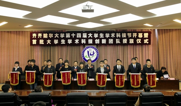 青春选择挑战,创新引领未来。在全党全国深入学习贯彻党的十七届六中全会精神之际,在我校全力推进高水平大学建设、喜迎母校六十华诞之时,为进一步培养我校学生的科研意识、创新精神和实践能力,大力促进我校课外学术科技活动的蓬勃发展,为我校高水平大学建设做贡献,向母校六十华诞献礼,以“青春·挑战·未来”为主题的我校第十四届大学生学术科技节开幕式暨学校首批大学生学术科技创新团队授旗仪式于11月10日下午,在我校德润大厦四楼会议室隆重举行。