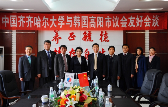 马立群校长对金毕礼议长一行的来访表示热烈欢迎,他向来宾详细介绍了我校教育教学的发展情况以及同韩国尤其是高阳市的教育界开展教育合作的相关情况。他说,齐齐哈尔市和高阳市是友好合作城市,此次高阳市议会代表团的到来,必将进一步增进两所城市之间的友谊,促进包括教育在内的各个领域的活动的开展,他希望通过双方高校间的合作共同打造中韩友谊的桥梁,为两国留学生创造更多的互相学习的机会,促进双方教育合作的深入开展。