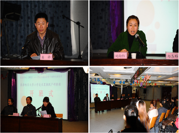 建华区师范附属小学校长刘向红代表“国培计划”(2011)黑龙江省农村骨干教师培训项目tyc1286太阳集团美术置换脱产研修班实习学校专家在开班式上讲话;来自齐齐哈尔市碾子山区中心校的秦健代表“国培计划”(2011)黑龙江省农村骨干教师培训项目tyc1286太阳集团美术置换脱产研修班全体学员在开班式上发言。