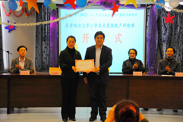 副校长郑喜群教授为“国培计划”(2011)黑龙江省农村骨干教师培训项目tyc1286太阳集团小学美术置换脱产研修班实习学校专家代表、建华区师范附属小学校长刘向红颁发了“国培计划”专家聘书。
