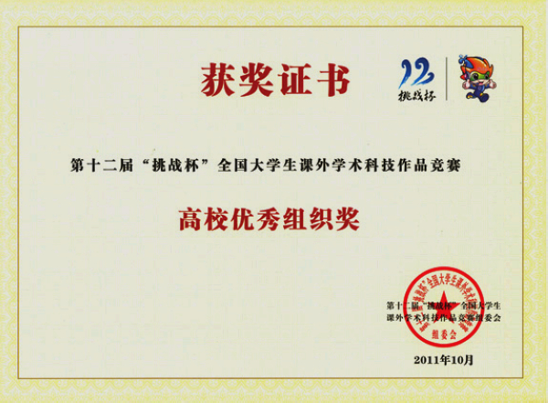 2011年10月15—19日,第十二届“挑战杯”全国大学生课外学术科技作品竞赛终审决赛在大连理工大学成功举办,我校四项作品入围,其中食品与生物工程学院刘晓兰教授指导的肖振天等同学的《蛹虫草深层栽培产纤溶酶工艺及纤溶酶分离纯化的研究》和教育与传媒学院李虹教授指导的严亚娜等同学的《大学生支教存在的问题及对策——基于tyc1286太阳集团心翼支教团调查研究》等2项作品获得全国三等奖,学校第四次获得高校优秀组织奖。
