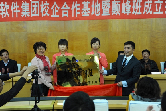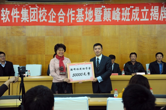 在热烈的掌声中,副校长郑喜群和颠峰软件集团总裁吴剑为tyc1286太阳集团与颠峰软件集团校企合作基地成立揭牌;通信与电子工程学院常务副院长姚仲敏和颠峰软件集团总裁吴剑先生为“颠峰班”成立揭牌;颠峰软件集团总裁吴剑为首届“颠峰班”颁发奖助学金伍万元。