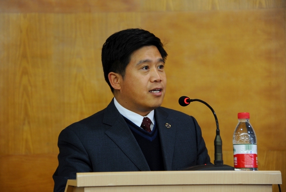 郑喜群代表学校致辞。他首先对颠峰软件集团总裁吴剑先生一行来校表示热烈欢迎,并对我校与颠峰软件集团共建校企合作基地、成立“颠峰班”表示衷心的祝贺!