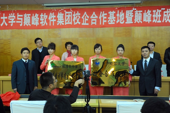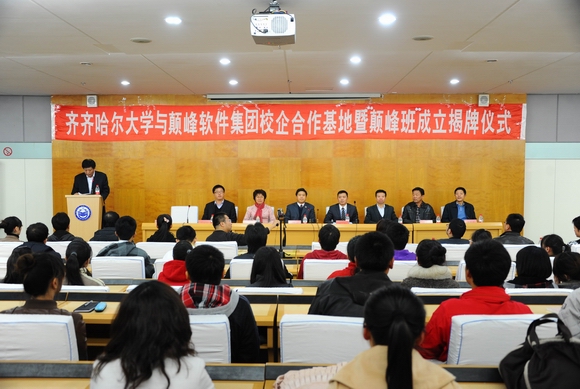 颠峰软件集团总裁吴剑在致辞中,对我校积极创新人才培养模式,拓展大学生就业渠道,为社会输送合格人才的做法给予高度评价。对我校已在颠峰软件集团工作的学生勤奋好学、踏实敬业的工作态度和较强的团队意识大为赞赏。他说,在与国内其他高校尝试合作共建的比较中,颠峰软件集团选择了齐大,原因就在于学校领导的先进办学理念,教师的敬业精神和学生踏实肯干的工作作风感动了企业的领导层。与贵校经过一年多的“初恋”,现在已进入“蜜月期”,期盼双方的合作能够结出更加丰硕的果实。今天校企合作基地暨“颠峰班”成立,更加表明了我们与齐大长期合作的决心与信心,祝愿齐大的明天会更好。