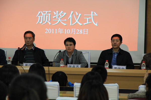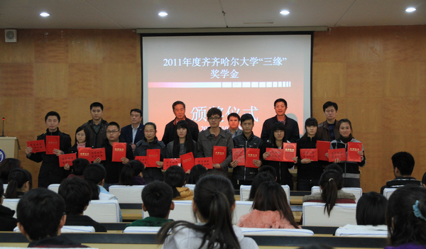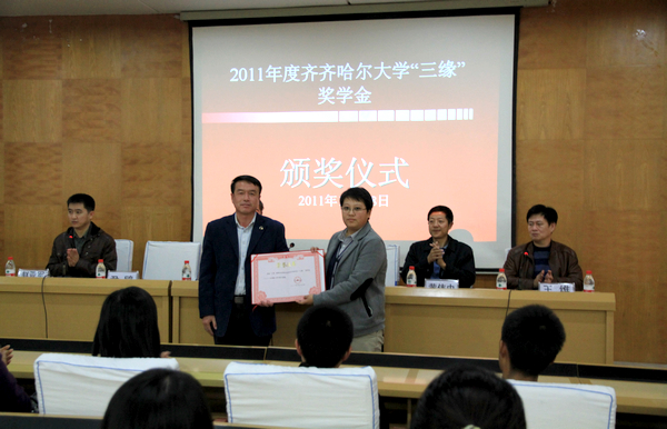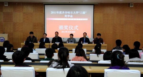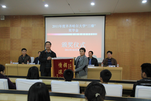 经济与管理学院院长王维宣读了2011年度获得奖学金学生名单。我校经济与管理学院校友、三缘木业齐齐哈尔瑞驰木业有限公司总经理张书齐女士,获奖学生代表、市场营销专业082班窦胜昌同学分别在颁奖仪式上致辞。