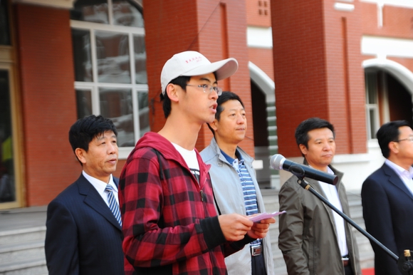 在出征仪式上,我校文学与历史文化学院2011级历史系研究生刘贺代表参加“重走抗战路”主题活动的全体学生在启动仪式上发言,表达了“永远跟党走、永铸民族魂”的坚强决心,发出了当代大学生弘扬抗战精神、勇担时代重任的铿锵誓言。