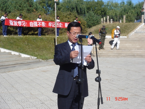 他指出,“重走抗战路”主题纪念活动,从2006年首次发起,至今已有六年时间。六年来,这项活动得到了齐齐哈尔市各级领导的高度重视,也得到了在齐高校、媒体和社会友人的积极支持和广大青年学生的广泛参与。如今,这项活动已成为大学生思想政治教育的品牌项目,也为高校更好地发挥文化传承创新作用,更好的服务地方社会发挥了重要的引领作用。今天,我们在纪念九一八这个特殊的日子里,再一次来到江桥镇,重温江桥抗战的悲壮历史,缅怀抗日英烈的丰功伟绩,目的是警醒我们增强忧患意识,勿忘国耻,珍爱和平;警醒我们铭记历史伤痛,传承薪火,共创未来。马占山将军江桥抗战的第一枪,震惊全国,感动世界,是历史留给齐齐哈尔——这座英雄城市的无上荣光,也是留给鹤城人民的一笔宝贵精神财富。