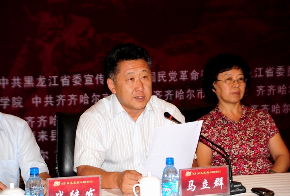 8月15日上午,纪念“江桥抗战”80周年研讨会开幕式在嫩江宾馆举行。全国政协常委、民革中央副主席郑建邦,全国政协常委、民革青海省委主委、马占山将军嫡孙马志伟等“江桥抗战”将士后代代表,中宣部宣教局处长李屹立,省政协副主席、民革黑龙江省委主委何小平,省委宣传部副部长陈永芳,齐齐哈尔市领导和我校校长马立群、党委副书记王凤琴出席了研讨会开幕式。党委宣传部部长李敏义、科技处副处长伊全胜及我校历史系部分教师参加了开幕式。
