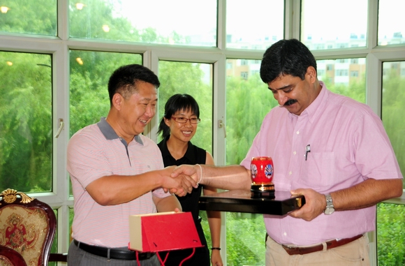 在格迈纳尔职业技术学院会议室,宾主双方召开了座谈会。副校长郑喜群代表学校对Kaul先生一行的到来表示热烈的欢迎,并简要介绍了学校的基本情况和近些年来取得的成绩。