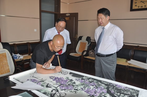 同时,我校美术与艺术设计学院张充吕教授创作了富于中国文化韵味的画作赠予黄天中校长。黄天中也即兴为题字留念。洽谈会上,充满了文化的气息。