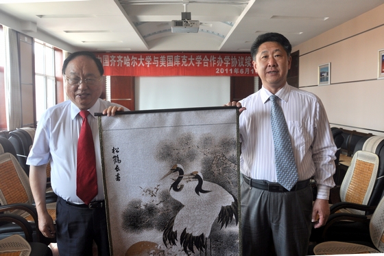 此次签约续签仪式的举行,是中美两校间的再度携手合作。工作会谈期间,马立群校长代表学校向黄天中赠送了“松鹤长春”艺术品。
