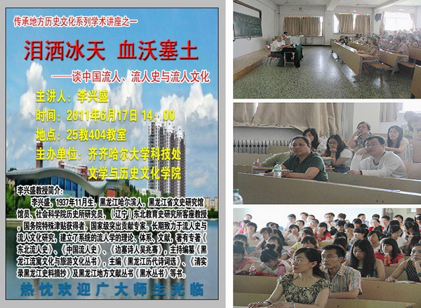 6月17日,著名流人史专家、黑龙江省文史馆李兴盛研究员应邀为文学与历史文化学院师生做了题为《泪洒冰天 血沃塞土——谈中国流人、流人史与流人文化》的专题学术讲座。