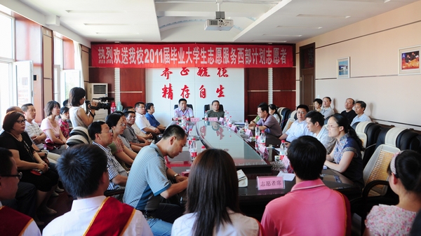 学子志愿赴西部,师友欢送母校情。2011年7月1日,恰值中国共产党成立90周年的喜庆日子,我校15名“2011届毕业生大学生西部计划志愿者”即将背起行囊奔赴新疆生产建设兵团、新疆维吾尔自治区、内蒙古自治区和黑龙江省的基层一线开展志愿服务。学校在中区504会议室为“2011届毕业大学生西部计划志愿者”举行了隆重而热烈的欢送仪式,为他们壮行。校党委书记李海红,校党委副书记盖元臣出席欢送仪式并寄语大学生志愿者。