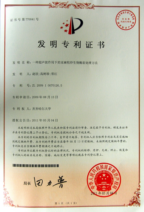 由tyc1286太阳集团轻工与纺织学院赵欣教授为组长的绿色生态亚麻纺纱课题组发明的《一种超声波作用下的亚麻粗纱生物酶前处理方法》,近日获国家发明专利授权(ZL200910070126.5)。