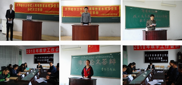 经过指导教师及答辩教师对专业理论知识方面的帮助与指导,通过答辩的整个环节,使学生进一步加深了对本专业知识的理解,涌现出计算机科学与技术专业杨乐(深圳航空有限责任公司)、机械设计制造及其自动化专业刘颖(上海晋奕精密机械有限公司)、汉语言文学专业谭瑞峰(讷河市拉哈镇人民政府)、英语专业王聪(大庆钻探钻井二公司培训文化中心)、会计学专业李巍(泰来县电业局)、音乐学专业王淑新(大庆市艺术学校)、董姣煜(中国人寿保险股份有限公司齐齐哈尔分公司)、数学与应用数学专业祈晶(齐齐哈尔市博园学校)等一批优秀答辩学员。