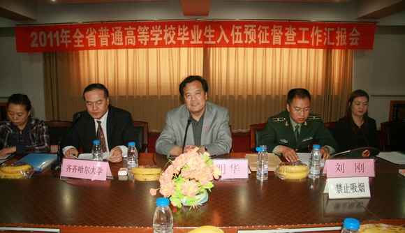 2011年全省普通高校毕业生入伍预征督查工作齐齐哈尔高校专题汇报会在我校培训中心5楼会议室召开。我校副校长王刚,2011年全省普通高校毕业生入伍预征督查工作第一督查组组长、省教育厅学生处处长张明华出席汇报会。省督查组成员、在齐各高校预征工作校级主管领导、各高校学生处、预征工作牵头部门及就业工作部门负责人、参加入伍预征的毕业生代表100余人参加了汇报暨座谈会。