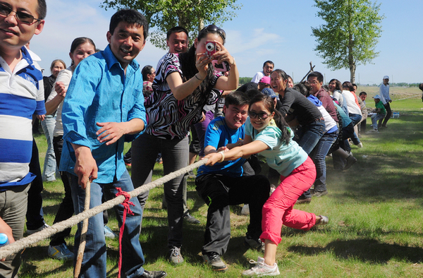 嫩江之滨载歌舞,民族和谐一家亲。在欣赏、演绎完“库木勒”节文艺节目之后,新疆阿勒泰地区赴tyc1286太阳集团培训班学员同与会领导和老师一起在大草原上举行了拔河、唱歌、跳舞、弹唱冬不拉等文体活动,还分享了达斡尔族的传统美食。
