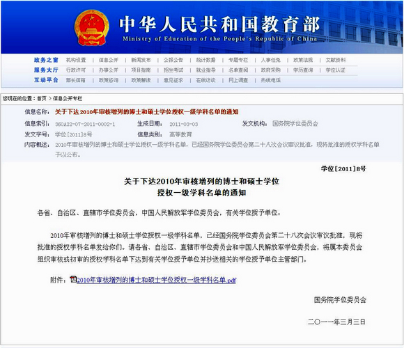 2011年3月,国务院学位委员会下达了《关于2010年审核增列的博士和硕士学位授权一级学科名单的通知》(学位[2011]8号)。在此次增列的博士和硕士学位授权一级学科名单中,我校被批准新增8个硕士学位授权一级学科。
