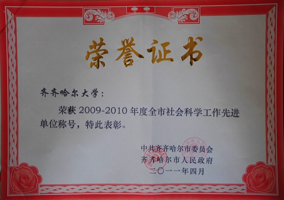 2011年4月25日,全市哲学社会科学工作会议在市党政中心6号楼4楼会议室召开,市委、市人大、市政府、市政协及市社科联的领导出席了会议,我校党委副书记王凤琴、党委宣传部长李敏义参加了会议。会上,表彰了2009—2010年度全市社会科学工作先进集体和先进个人,我校再次荣获齐齐哈尔市社会科学工作先进单位,校党委副书记王凤琴、党委宣传部长李敏义、经管学院院长王维、科技处副处长伊全胜、文学与历史文化学院历史系主任周彦、中文系主任赵忠山等被市委市政府命名为先进个人。