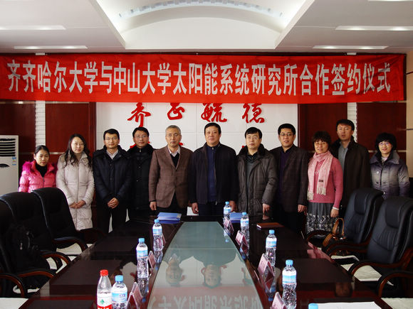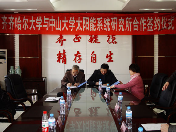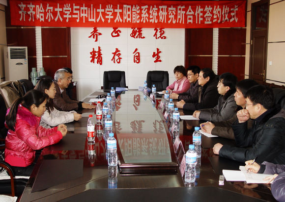 在热烈、友好的气氛中,我校副校长邓启刚代表学校与中山大学太阳能研究所所长沈辉正式签署了合作意向书。