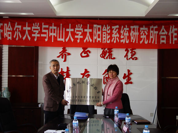 我校通信与电子工程学院常务副院长姚仲敏与中山大学太阳能研究所所长沈辉为光伏系统联合实验室举行了揭牌仪式。
