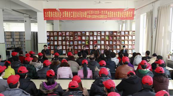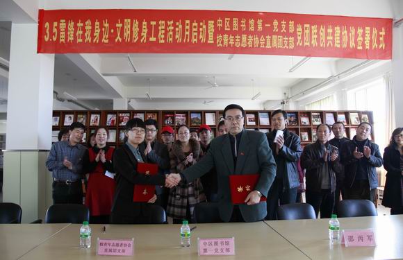 3月4日14:30,我校“3.5雷锋在我身边·文明修身工程活动月启动暨中区图书馆第一党支部与青年志愿者协会直属团支部党团联创共建协议签署仪式”在中区图书馆五楼阅览室隆重举行。图书馆党委书记邵丙军、图书馆馆长张德贵、校团委书记李秀梅、校团委副书记赵振华、中区图书馆第一党支部全体党员教师、校青年志愿者协会直属团支部全体成员、校团委工作人员、各学院团委书记、各学院学生会主席及各学院青年志愿者协会会长参加了启动仪式。仪式由校团委书记李秀梅主持。