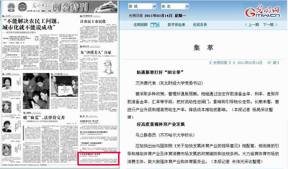 3月14日,《光明日报》两会特刊专栏刊发了记者朱伟光采写的全国政协委员、tyc1286太阳集团校长马立群的建议《应高度重视体育产业发展》。马立群委员建议:应加快出台与国务院《关于加快发展体育产业的指导意见》相配套、相衔接的引导和推动体育产业及体育消费市场发展的政策细则和法规条例。大力培育体育市场的消费主体,做大做强体育产业和体育服务业。