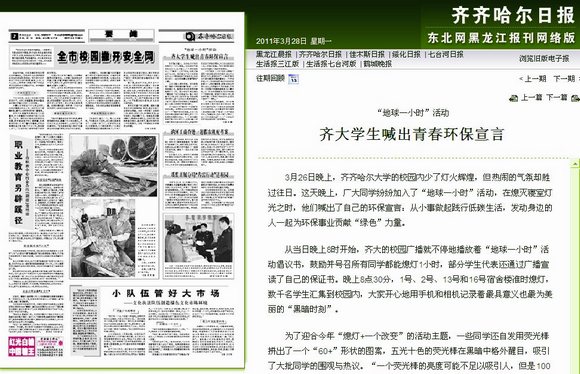 2011年3月24日,黑龙江省高校后勤管理指导中心、黑龙江省教育后勤管理协会向各普通高等学校、广大师生员工发出《2011年“地球一小时”活动倡议书》。