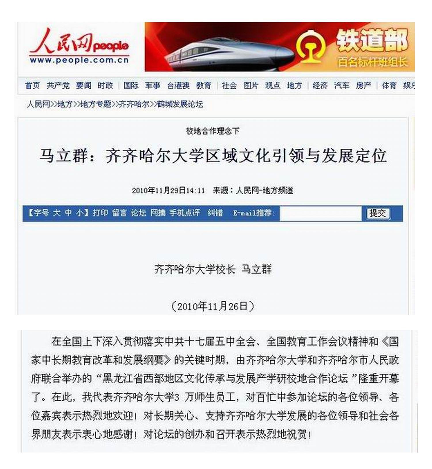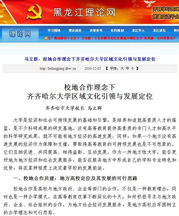 12月3日,由黑龙江省委宣传部主办的“黑龙江理论网”的“理论前沿”以《校地合作理念下tyc1286太阳集团区域文化引领与发展定位》发表了马立群校长的署名文章,在理论界与高教界产生了广泛而积极的反响。