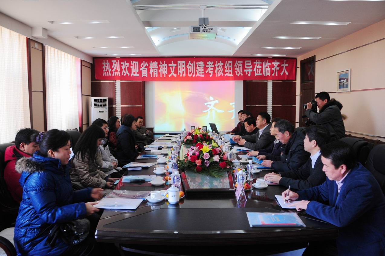 汇报会上,马立群校长代表学校及广大师生员工对省精神文明创建活动考核组一行莅临我校考核指导我校国家级文明单位创建工作表示热烈欢迎和衷心地感谢。他向考核组一行概要介绍了学校创建工作的基本情况及工作思路。马校长指出,我校文明单位创建工作更新理念,突出主题,活化载体,创新模式,形成了“六个三”的工作思路。一是突出三个着眼点,不断深化文明单位创建工作的内涵;二是强化三个着力点,不断提高师生员工的思想道德素质;三是把握三个关键点,不断提升文明单位创建工作的实效;四是打造三个闪光点,不断形成齐大精神文化品牌;五是围绕三个生长点,不断推进学校内涵发展;六是夯实三个支撑点,不断完善文明单位创建工作的长效机制。