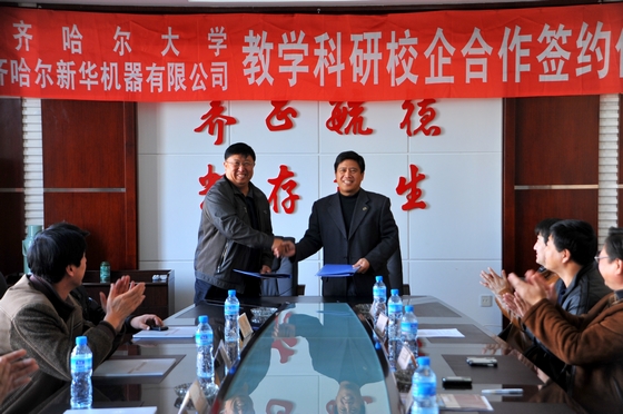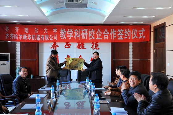 会上,我校副校长郑喜群、齐齐哈尔新华机器有限公司总经理王尔建共同在有关合作文本上签字。我校实践教学与设备管理处副处长祝文生、齐齐哈尔建华电梯有限公司总经理张晓丹共同为“教学实习基地”揭牌。黑龙江北方汽车制动系统有限公司总经理刘景华与我校机电工程学院常务副院长王世刚共同签署了《汽车制动器系统关键部件的研制》项目合作协议。