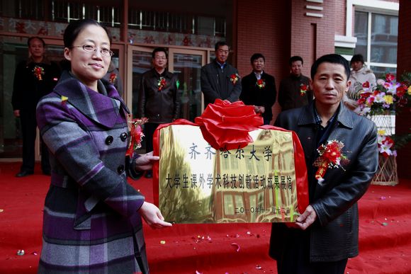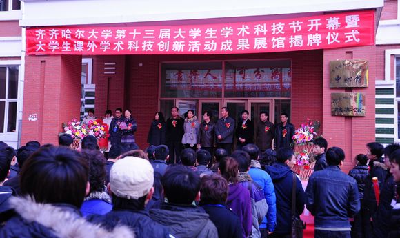 在仪式上,校党委副书记盖元臣、副校长姜守训为大学生课外学术科技创新活动成果展馆揭牌、题词。
