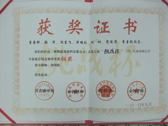 挑战孕育梦想,创业铸就辉煌。“挑战杯”竞赛是由共青团中央、中国科协、教育部、全国学联和地方政府等单位共同主办,国内著名大学、新闻媒体联合发起的一项具有导向性、示范性和群众性的全国竞赛活动,被誉为当代大学生科技创新的“奥林匹克”盛会,并日渐成为我国培养学生自主创新能力的重要平台,成为高校展示学生创新能力和科研水平的重要舞台。本届竞赛由共青团中央、中国科协、教育部、全国学联联合主办,吉林大学、长春市政府联合承办,吸引了内地及港、澳、台地区160余所高校,共计3000余人参加,其中有54所学校的作品进入终审答辩,我校推荐的参赛作品《神鹤建筑材料有限责任公司创业计划书》入围终审决赛,并获得全国大学生创业计划竞赛终审决赛三等奖。