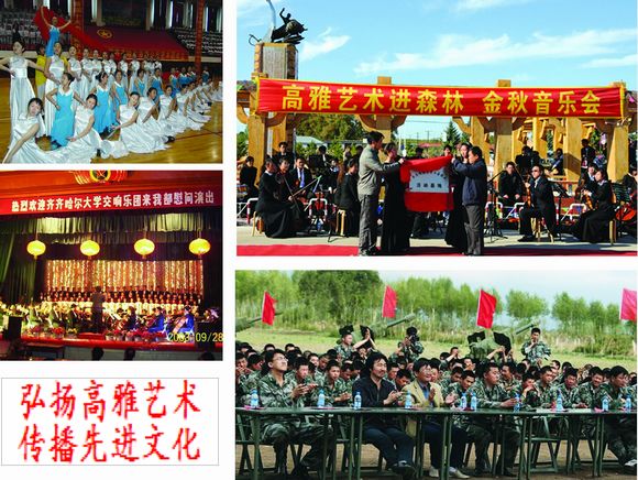 多年来,我校发挥交响乐团、师生合唱团等专业艺术团队的资源优势,去工厂、部队、企业还是农村,以“文化惠民工程”促进社会和谐,参加教育部高雅艺术进校园、绿博会、关东文化节、和平节、齐齐哈尔新年音乐会等演出180余场,承担群众文化展演任务300余场次,在弘扬高雅艺术中蜚声艺苑,香飘校园,辐射社会,成为我校文化校园的响亮品牌;举办5次中韩美术文化交流活动和两届中国亚麻服饰设计大赛暨国际现代设计专家论坛,主持设计了马恒昌主题公园、江桥抗战纪念馆中的“战迹沙盘”和“纪念壁画”,发挥音乐厅、美术馆、文化宫、体育馆等群众文化硬件资源优势,共承担群众文化展演任务300余场次,提升了本地区群众文化层次,树立了城市文化品牌形象,每一场演出都让现场的观众听者动容,大有“既去而余音绕梁,三日不绝”之感。学校真诚邀请了莫斯科柴可夫斯基音乐学院“泰斗级”人物、世界著名指挥大师波里斯?杰夫林教授、中国交响乐团联盟主席、中国音乐家协会交响乐爱好者学会副会长、中国电影音乐学会特约理事、国家一级指挥卞祖善、全国著名钢琴大师刘诗昆等大师,开展了广泛的高雅文化交流活动。充分发挥交响乐团、师生合唱团等专业艺术团队的群众文化软件资源优势,活跃丰富演出市场,在教育部高雅艺术进校园巡回演出、全国第四届特奥会、中国?哈尔滨第29届哈尔滨之夏音乐会、龙沙音乐会、劳动湖之夏音乐会、一年一度的绿色博览会、连续多年的齐齐哈尔新年音乐会、关东文化旅游节、赴黑龙江省农垦总局九三分局进行慰问演出、华安集团有限公司、大庆石化总厂、举办慰问驻齐部队官兵专场音乐会专场等演出达180余场。产生强烈反响,赢得了省教育厅的特别嘉奖。发挥音乐厅、文化宫、体育馆等群众文化硬件资源优势,共承担群众文化演出任务260余场次。经教育部审批,在2006年的“高雅艺术进校园”活动中,我校交响乐团将在我省各高校做巡回演出。黑龙江日报2006年6月11日在第一版以《高雅艺术打造一流名校 tyc1286太阳集团交响乐团发展启示录》为题做了专门的报道。
