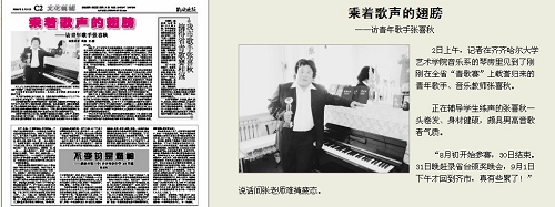 金灿奖杯凝结劳动汗水,丰硕果实源于不辍耕耘。9月2日,我校艺术学院青年教师张喜秋载誉归来。9月8日,《鹤城晚报》刊发了该报记者冯涛等采写的新闻《我市歌手张喜秋摘得省青歌赛桂冠》及冯涛采写的题为《乘着歌声的翅膀—访青年歌手张喜秋》的专访,对此次获奖情况及张喜秋的音乐成长之路进行了热忱报道。
