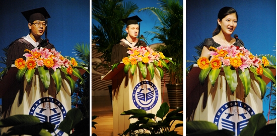 在校生代表、教育与传媒学院刘淇同学,教师代表、省级教学名师奖获得者、生命科学与工程学院副院长邵淑丽教授先后在毕业典礼上发言。他们祝贺2009届学生顺利毕业并荣获学位,祈愿祖国繁荣昌盛,祝福母校再创辉煌。