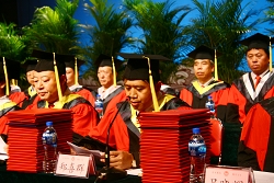 出席毕业典礼的校领导首先为研究生,留学生,本、专科毕业生代表颁发毕业证书,并为获得优秀毕业生代表颁发了荣誉证书。