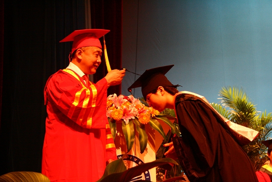 在充满感情的颁授音乐声中,获得硕士学位的毕业生代表、获得学士学位的留学生代表、获得学士学位的中外合作办学的毕业生代表及获得学士学位的毕业生代表身着学位服依次踏上主席台,从校长马立群教授手中领取毕业证书和学位证书,庄重地接受学位授予。在校长马立群教授一一亲自为他们正冠拨苏时,全场师生报以热烈的掌声向他们表示热烈祝贺!