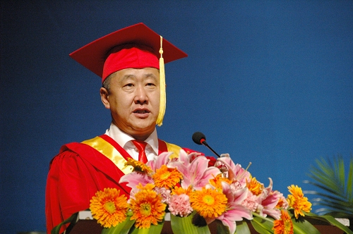 他说,四年前,你们怀着家人的嘱托和对知识对真理的执着追求,意气风发,英姿勃勃,从祖国的四面八方来到仙鹤飞翔的地方和美丽的环湖大学,风光旖旎的劳动湖畔留下了你们奋斗的足迹,不仅系统地掌握了各种专业知识,成为各自领域的专门人才,而且施展才华,取得了优异的成绩。这既是老师们谆谆教导的结果,也是你们勤奋学习的结果;这既是你们的荣耀,也是你们家人的荣耀,更是齐大的荣耀!