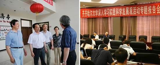 借此次会议在我校召开契机,学校邀请出席此次学术会议的教育部人文社会科学重点科研基地—吉林大学哲学基础理论研究中心主任、博士生导师、著名学者孙正聿教授,为我校师生作了深入学习实践科学发展观活动的专题报告,并对深入学习实践科学发展观活动骨干进行培训。校领导史铁成、王凤琴、曲伟健、姜守训、郑喜群、邓启刚等同与会专家学者进行了亲切的交流。