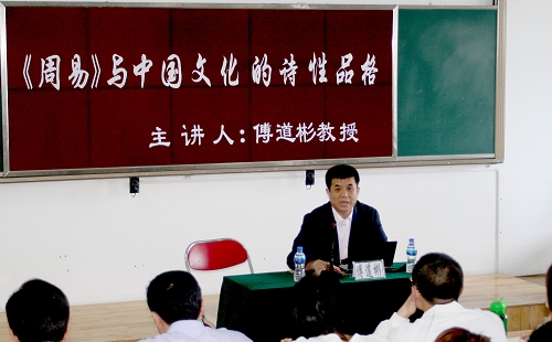 在人文楼(25教)404阶梯教室,傅道彬教授为人文学院师生作了题为《< 周易>与中国文化的诗性品格》的学术报告。人文学院院长王则远主持了报告会,该学院领导、系主任、专业带头人、部分教师、研究生、本科生200余人聆听了报告。