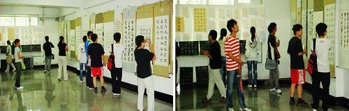 6月1日,人文学院中文系与齐齐哈尔市语言文学学会在东区人文楼二楼大厅联合举办素质教育成果展之“红烛杯”书艺作品展。本次展出集中展示人文学院中文系素质教育成果,是该系深入学习实践科学发展观,彰显中文专业特色,推动人文素质教育上水平、创特色的重要举措,激发了广大学生实践创新、苦练基本功的热情,吸引广大师生驻足浏览与欣赏。