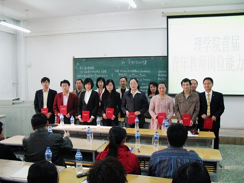 实施竞赛制,当好教练员。理学院开展了青年教师岗位能力竞赛活动,营造了比学赶超的学习氛围。2009年4月29日,该学院组织了理学院青年教师岗位能力竞赛活动,全体青年教师积极选派代表参赛。8名参赛选手认真对待、精心准备。在竞赛中,8名参赛教师以清晰的思路、流畅的语言、严密的教学逻辑充分展示了青年教师的风采。教务处、人事处有关部门人员与理学院全体教师一起观摩了比赛。在此次竞赛中,全体参赛的青年教师从板书设计与书写、图表的结构与排列、语言、教态、特别是课程设计、重点难点的处理方法、教学手段、方法的运用等都有上佳表现。竞赛结束后,教务处、人事处等相关部门人员及该学院党委书记李军、院长堵秀凤、副院长王少华等为获奖的青年教师颁发了获奖证书。该院院长堵秀凤教授在总结时对青年教师提出了希望和要求。青年教师倍受鼓舞,表示将继续努力,岗位建功。