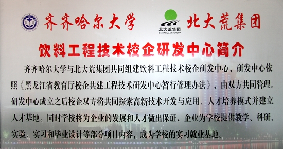 4月16日上午,我校与北大荒集团绥化分公司共同组建的饮料工程技术校企研发中心在生命科学楼隆重揭牌。该中心的组建是我校深入开展学习实践科学发展观活动的又一可喜成果,是我校认真贯彻落实《黑龙江省高等教育强省建设规划》,实施校企共建共同发展的重要举措。
