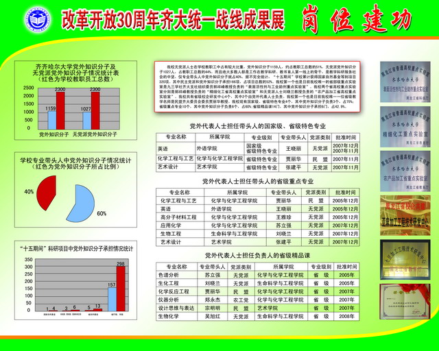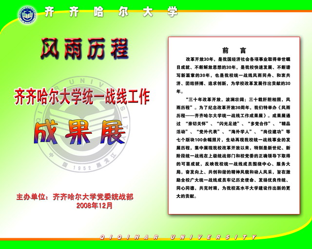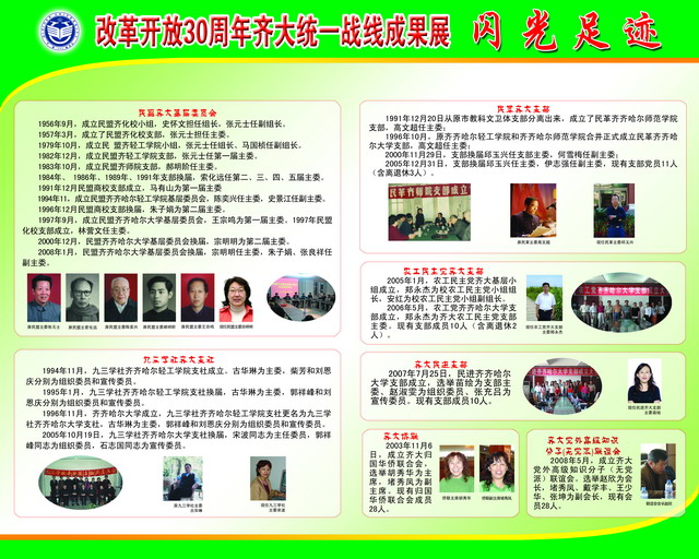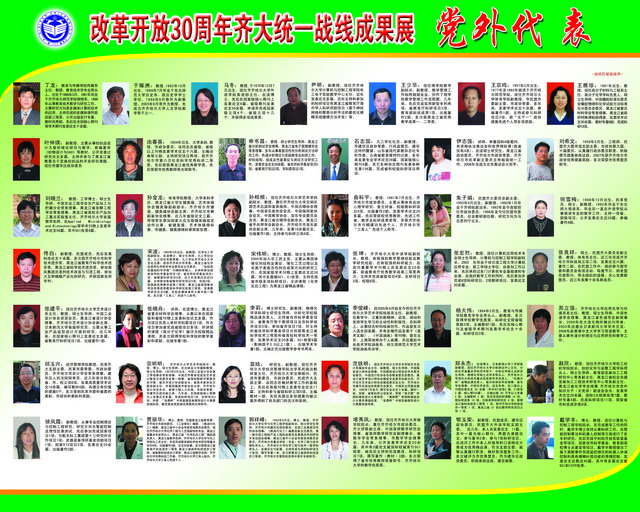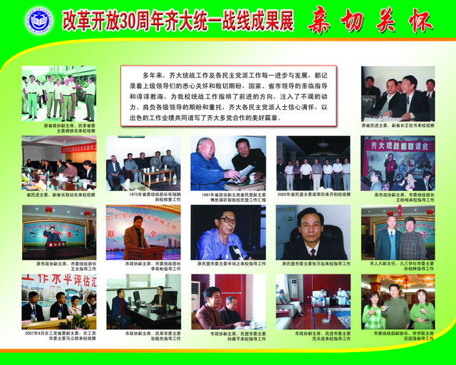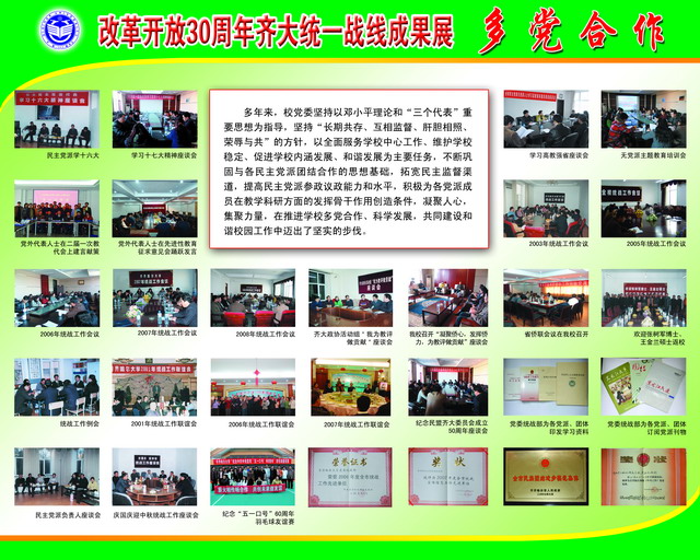 我校统战工作得到了校党委的高度重视,得到了市、区统战部,市、区政协组织的亲切指导、关心和支持,得到了各民主党派市委的支持和帮助。齐大民盟基层委员会、九三学社齐大支社、民革齐大支部、农工民主党齐大支部几年来均被评为市级先进集体,九三学社齐大支社被评为省九三学社先进支社,齐大民革支部被民革省委命名为先进党支部。在全市统战工作会议上,我校党委统战部被市委统战部被命名为统战工作先进集体,并在会上进行了工作经验交流。我校统战工作经验材料《坚持多党合作,共建和谐校园》被中央统战部评为优秀论文,刊发在中央统战部新世纪新阶段中国统一战线事业专著《社会主义和谐社会理论与实践》中。在全市统战工作会议上,我校党委统战部被市委统战部授予“全市统战宣传信息工作先进单位”。2008年5月,学校统战系统举行了“纪念中共中央发布‘五一口号’60周年羽毛球友谊赛”,成立了齐大党外高级知识分子(无党派)联谊会,无党派政治交接教育活动、民主党派精品活动推动了学校多党合作事业的蓬勃发展,统战工作取得了一系列喜人佳绩。