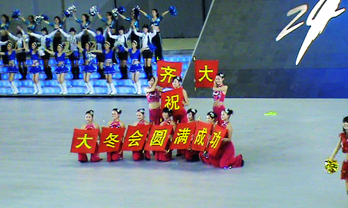 2月18日晚18:30,哈尔滨国际会展中心体育馆内流光溢彩,青春的激情在这里点燃。伴随着热烈的音乐,当我校十名跳操同学手中的花棍忽然变成了“齐大祝大冬会圆满成功”的十个大字时,观众纷纷为这一具有魔术效果的创意鼓掌叫好,参加开幕式活动的我校党委副书记史铁成对此大加赞许。