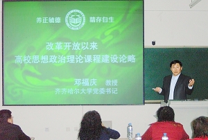 2008年11月26日下午,社会科学教研部直属党支部邀请学校党委书记邓福庆教授在11教308教室,为党员和师生作了题为《改革开放以来思想政治教育的学术发展》和《改革开放以来高校思想政治理论课程建设论略》两场学术报告。邓书记以高校思想政治理论课的发展沿革为主线,从学术的独特视角深刻阐释了改革开放以来我国的巨大变化和高校改革发展的光辉历程,使听报告者不仅受到了思想教育,也受到了学术熏陶。
