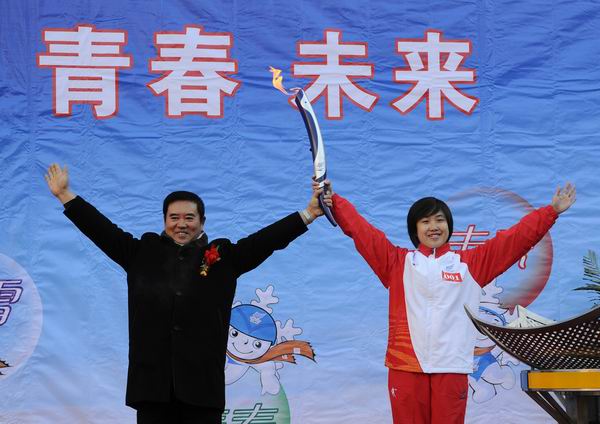 哈尔滨第24届世界大学生冬季运动会冰雪使者手持火种灯入场,从火种灯内取火并点燃火炬;第24届大冬会组委会副秘书长、省教育厅副厅长孟凡杰将“冰韵天鹅”火炬交与齐齐哈尔市委书记杨信,由杨信点燃火种盆并将火炬交给第一棒火炬手、我校思想政治教育专业2008级硕士研究生李宴群。
